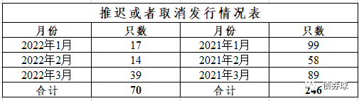 一般來說,每年1月份或者2月份大概率會碰到春節,發行活動一般不是很多,進而取消發行的數量也相對較低。2022年的數據的確比較符合這一邏輯,但是對比一下2021年同期的數據,似乎又難以說得通。2021年1季度, 1月份取消發行最多。