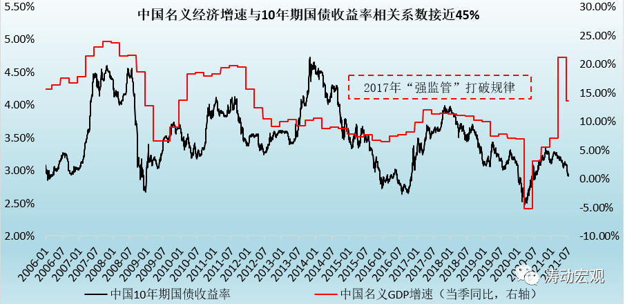 (2)近年以來,名義經濟增速與長端利率水平之間的相關性受到各種因素干擾,不穩定性較為明顯,且這種不穩定性應主要取決于政策端與供給端。