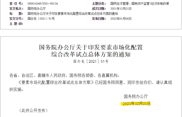2022年1月6日,國(guó)辦對(duì)外發(fā)布了《要素市場(chǎng)化配置綜合改革試點(diǎn)總體方案》(下文簡(jiǎn)稱“方案”)。方案是2021年12月21日印發(fā)的。