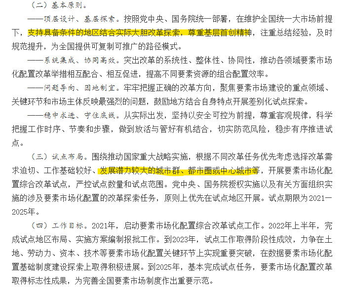 且明確說(shuō),要素市場(chǎng)化配置的改革探索任務(wù),原則上優(yōu)先在試點(diǎn)地區(qū)開展。