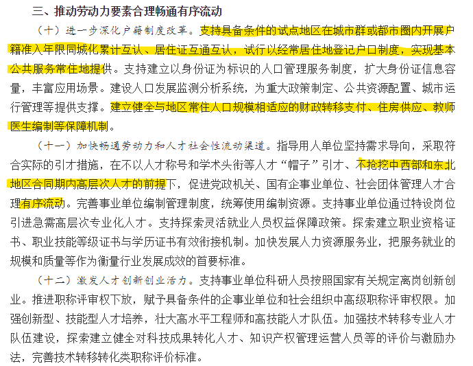 7、讓更多人自由遷徙、市民化,房地產(chǎn)受益,同時(shí)強(qiáng)調(diào)住房供應(yīng)保障機(jī)制。方案第三部分“推動(dòng)勞動(dòng)力要素合理暢通有序流動(dòng)”,談到支持具備條件的試點(diǎn)地區(qū)在城市群或都市圈內(nèi)開展戶籍準(zhǔn)入年限同城化累計(jì)互認(rèn)、居住證互通互認(rèn),試行以經(jīng)常居住地登記戶口制度,實(shí)現(xiàn)基本公共服務(wù)常住地提供。