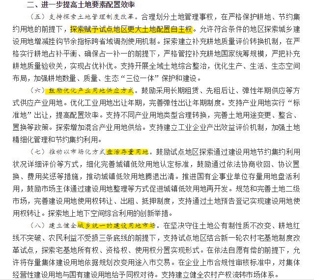 4、方案具體的試點(diǎn)第一項(xiàng)就談土地,更多地方或許納入土地自主權(quán)試點(diǎn)。嚴(yán)格保護(hù)耕地、節(jié)約集約用地的前提這些必然要說(shuō)的,接著說(shuō):