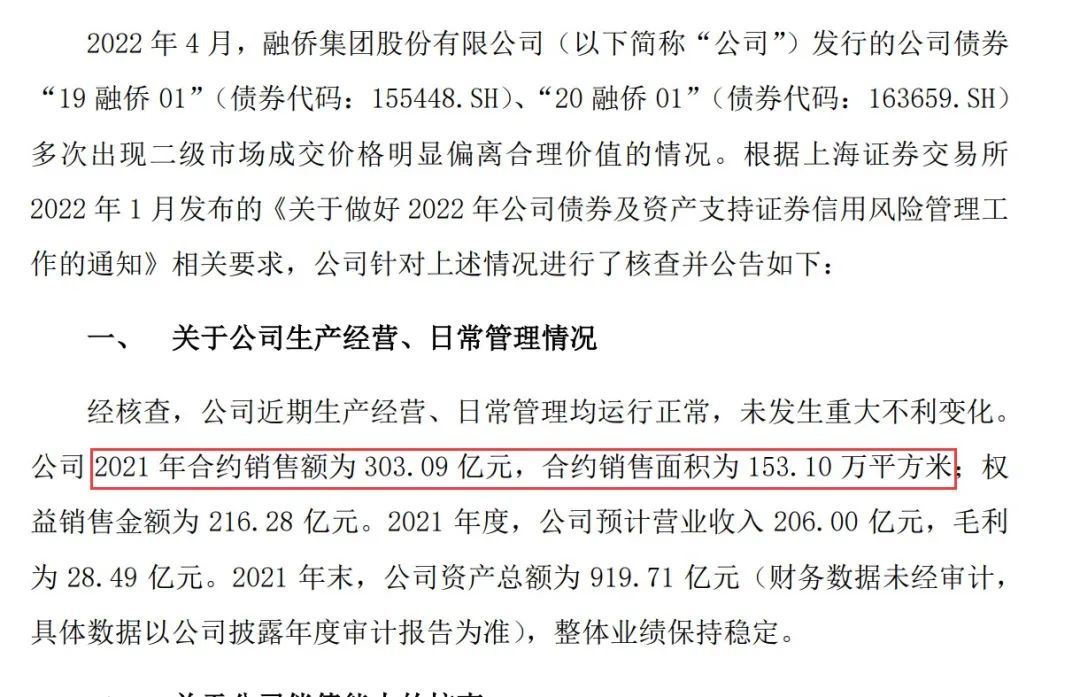 以最新數(shù)據(jù)為例,據(jù)融僑集團(tuán)公告披露,2021年其合約銷售額為303.09億元,合約銷售面積為153.10萬平米;權(quán)益銷售金額216.28 億元。2021年預(yù)計營業(yè)收入206.00億元,毛利28.49億元。2021年末資產(chǎn)總額為919.71億元.