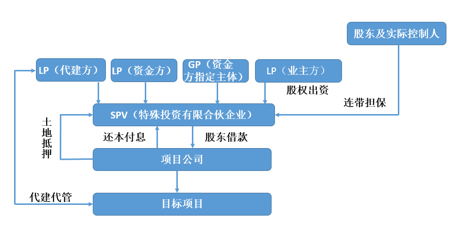 資金方愿意投錢項目往往基于對代建方的資質與品牌的認可,因此通常與代建方共同設立SPV(特殊目的實體,常見為有限合伙形式),代建方作為LP認繳跟投合伙企業少量份額,資金方作為LP認繳大部分合伙企業份額,業主方作為LP以股權作價出資至合伙企業,再由資金方指定一個主體作為GP擔任SPV執行事務合伙人。SPV設立之后,通過項目盡調發現的問題需要業主方解決的,將該問題作為放款的先決條件,解決之后資金方通過借款形式將資金投入SPV,此時SPV以股東借款或委托貸款等形式進行放款。模式如下圖: