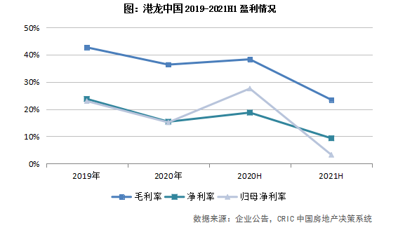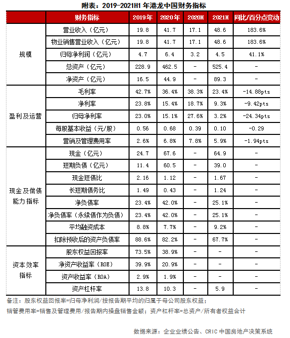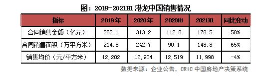 業績增長超行業平均,目標完成率51.7%。2021年上半年,港龍中國合約銷售金額178.5億元,同比增長約58%,高于百強房企平均40%的銷售增長率。同期銷售面積148.8萬平方米,同比增長65%。管理層在2020年中期業績發布會上表示2021年的銷售目標為345億元,前6月目標完成率51.7%,高于行業49%的平均水平。