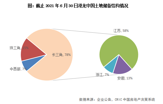 近八成土儲位于長三角,重倉江蘇省。截止2021年6月30日,港龍中國在全國共擁土地儲備總建筑面積為1075.7萬平方米。從分布來看,長三角土儲建面占比達78%,市場地位持續鞏固,但也存在土儲集中分布的風險。從省份來看,長三角的江蘇省總土儲建面占比相比2020年上升4個百分點,達58%,從新增土儲分布來看,未來比例或會進一步上升。此外,安徽省與年初持平,而浙江省占比下降4個百分點至7%。珠三角土儲主要分布在廣東省,占比達15%。中西部的河南、貴州和四川土儲建面占比共計7%。