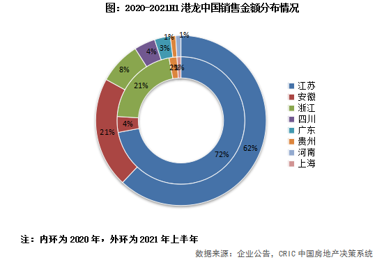 長三角銷售額占比91%,安徽省銷售強勁。從銷售金額的分布來看,長三角作為大本營,占比高達91%。江蘇作為發家地,銷售金額占比雖相比2020年下降了10個百分點,仍達62%。根據CRIC監測的江蘇12個城市榜單來看,企業只在常熟、常州和宜興3個城市上榜,港龍在未來還需加大本土市場的深耕,省內業績還有提升空間。安徽作為2020年新進省份,銷售強勁,地位替代浙江,銷售額占比相比2020年提升17個百分點至21%,位列第二。其余省份銷售額占比均小于10%,其中廣東和四川同為2020年新進省份,開始貢獻銷售額,占比分別為4%和3%。