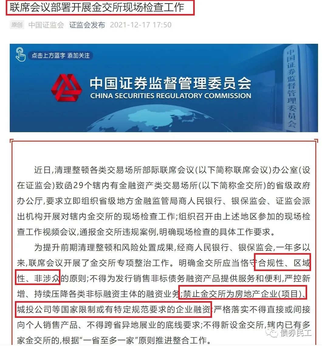 1、中國證監會牽頭的清理整頓各類交易場所部際聯席會議于2021年12月17日發布《聯席會議部署開展金交所現場檢查工作》,提出了對于金融資產類交易所新的監管要求。本次聯席會議對于金交所的監管提出了很多的要求,最關注的是其中對于城投公司的監管規則:“禁止金交所為房地產企業(項目)、城投公司等國家限制或有特定規范要求的企業融資”,這應該是金交所的監管規則中對于城投公司融資最直接、最重要的一條監管要求。在這個要求之下,城投公司和房地產公司獲得金交所融資的可能性幾乎為零。