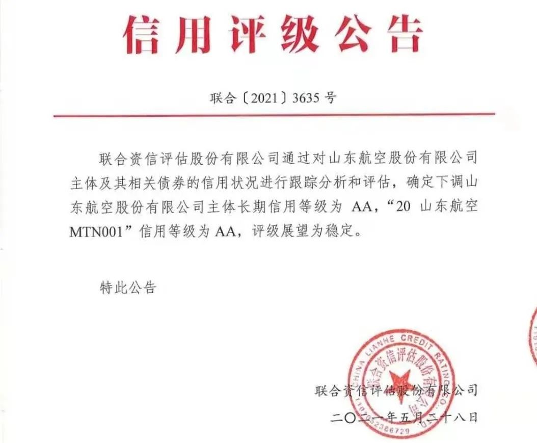 根據公開信息,山東航空于2020年3月18日首次取得聯合資信AAA主體信用評級,并分別于2020年5月29日、2020年9月17日取得AAA主體信用評級。山東航空最新的評級就是2021年5月28日主體評級下調至AA。