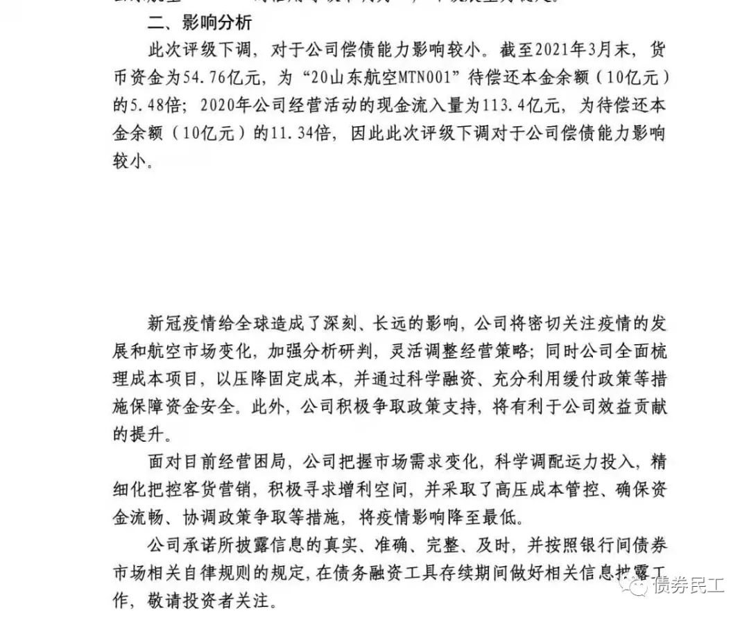 山東航空于2021年5月31日披露了上述聯合資信的評級下調報告,并于6月2日披露了評級下調公告,確認此次評級下調對公司償債能力影響較小,公司有較為充足的貨幣資金償還“20山東航空MTN001”。