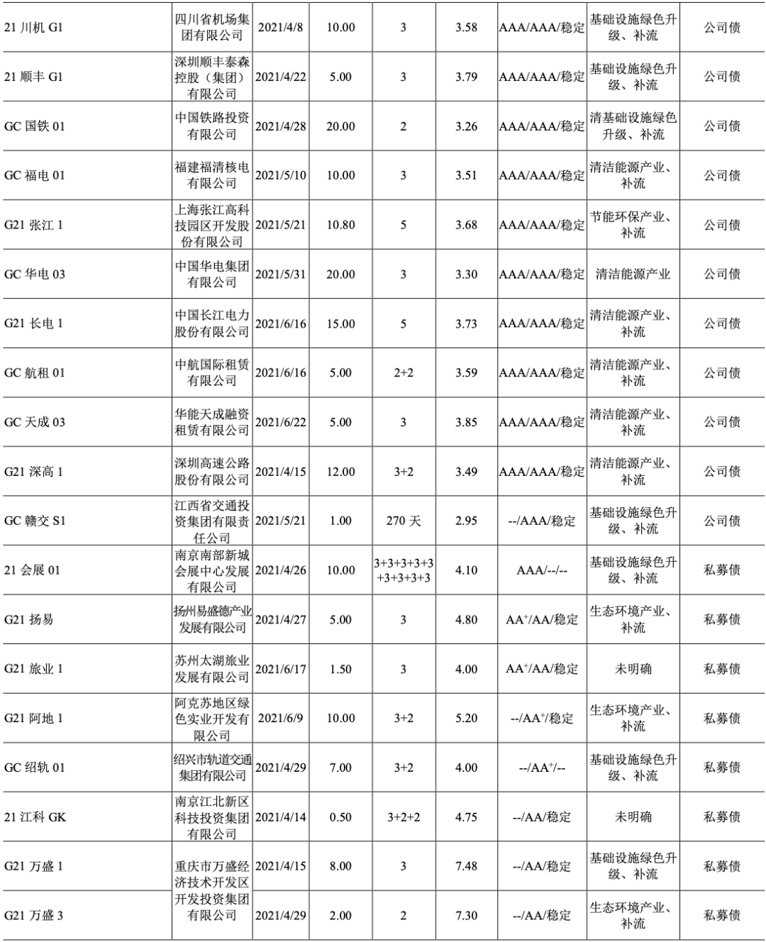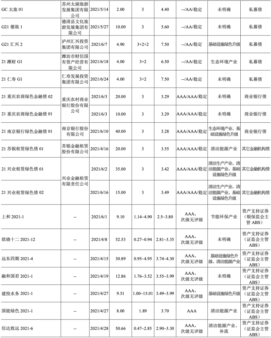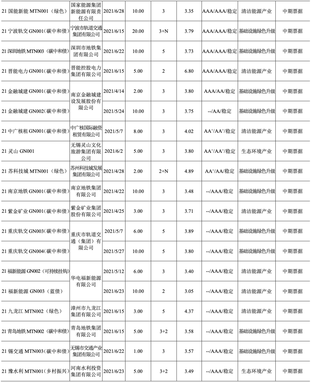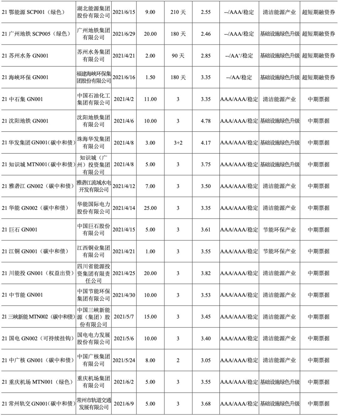 2021年4月12日,中債研發中心和深圳客戶服務中心聯合發布《中債-綠色債券環境效益信息披露指標體系(征求意見稿)》及2020年“實質綠”信用類債券樣本券環境效益信息披露數據,向社會公開征求意見。指標體系針對綠色行業6個大行業203個子行業,設計了30個通用指標和13個特殊指標(適用于單一行業)。同時,按照指標體系,對2020年度發行的327只“實質綠”信用類債券募集說明說書中披露的相關環境效益信息進行摘錄、歸集,與指標體系同步發布并征求意見。(摘自中國債券信息網,2021年4月12日)