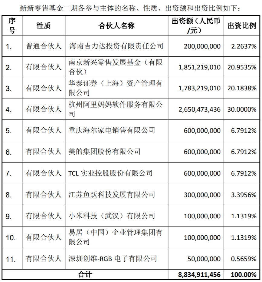 根據(jù)披露的數(shù)據(jù),新新零售基金由南京市國資和阿里領(lǐng)銜美的、海爾、小米、TCL、創(chuàng)維等產(chǎn)業(yè)投資人組成,總共認(rèn)繳出資額88.35億元,其中LP(有限合伙人10家),GP(普通合伙人)1家。