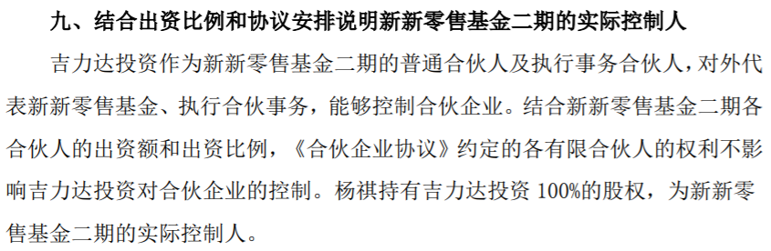 所以新新零售基金二期的控制人為海南吉力達(dá),自然人楊祺持有海南吉力達(dá)100%股權(quán),因此,楊祺為新新零售基金二期的實際控制人。