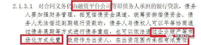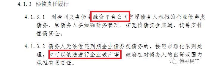 (2)對(duì)于企業(yè)債券的償債責(zé)任履行,鼓勵(lì)債務(wù)人(融資平臺(tái)公司)按照企業(yè)債券類債務(wù)有關(guān)管理政策進(jìn)行債務(wù)重組或者通過企業(yè)破產(chǎn)等市場(chǎng)化方式處置。這里的企業(yè)債券概念應(yīng)該是廣義上的信用債券概念,也是通過債務(wù)重組和破產(chǎn)方式進(jìn)行化解債務(wù)問題。