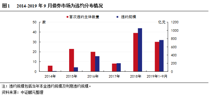 截止2019年9月30日,我國債券市場共發生實質違約事件的主體126家,涉及債券360只。據不完全統計,違約債券的累積逾期本金規模達2,321億元,累積逾期利息規模188.60億元[2]。