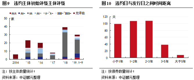 2017年及之前,違約債券發行時的初始評級大多在AA級(含)以下以及無主體評級的債券,在違約日之前的主體的評級則大多為A+級(含)以下及無主體評級。2018年之后,違約主體的評級開始向高等級擴散,2018年-2019年9月,有3家初始評級為AAA的主體違約,2019年1-9月初始評級AA+級以上違約主體的占比甚至達到了23%。