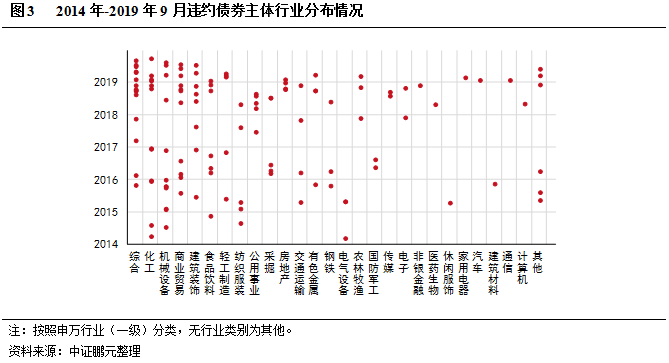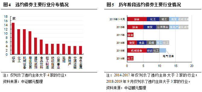 2、違約債券的行業特征從集中到分散,較多發生在綜合、化工、機械設備、商業貿易等行業