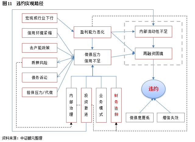 惡意違約和增信失效直接導致違約。惡意違約的企業通常伴隨虛假財務信息、資產轉移、股權套現等行為。一旦相關違法違規的負面信息被挖掘,引發企業負面形象、司法訴訟、資產或股權凍結、銀行抽貸等,最終企業資金鏈斷裂。增信措施是債券本息償付的最后防線,但抵質押瑕疵、擔保人拒絕代償或償債能力也弱的情況下,增信措施也形同虛設。