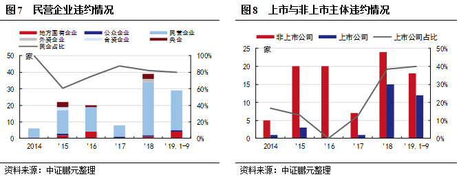 2014年-2019年9月,我國違約債券分布于27個行業。整體來看,違約事件較多發生在綜合、化工、機械設備、商業貿易等行業,這些行業違約的主體數量均在10家以上。違約主體所屬行業由從2018年從之前集中于某幾個行業開始向各行各業擴散,至2019年9月,除銀行以外的其他行業均有違約事件發生。違約主體較多的行業普遍存在行業增長乏力、競爭激烈等情況,如化工、紡織服裝、商業貿易等。同時,這些違約主體多為民企且規模較小,在經濟增速放緩和信用環境緊縮環境下更難以獲得或保持競爭優勢、抗風險能力弱,因而易成為違約高發行業。