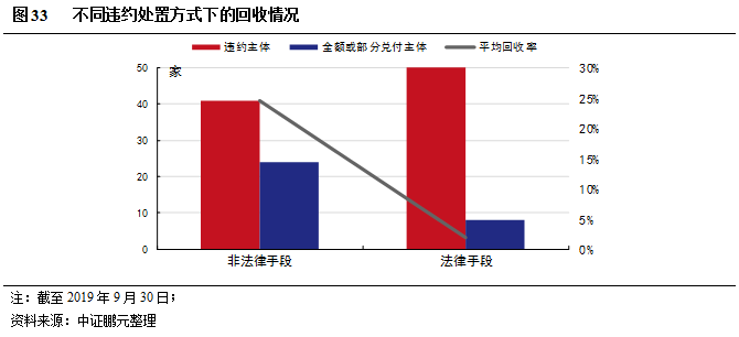 如前文所述,2014-2016年違約原因多數是宏觀或行業周期下行因素所致,約有1/3的違約主體的高負債問題不明顯,相對于高負債的企業而言回收預期較好,能夠通過資產處置、再融資等方式進行自償。而在2018-2019年9月發生的違約中,違約原因更多的是償債壓力過大,外部表現即為債務訴訟和破產重整申請,這表明違約主體已經出現內部流動性和信用不足,同時也缺乏用于處置或者抵質押的有效資產,亦或是主體惡意違約。在此背景下,通過內部協商等手段進行處置效果和效率都很低,應當第一時間采取財產保全措施,并盡快進行破產重整,以司法壓力下推進處置進程。因此,債務訴訟、破產重整等法律手段往往是投資人對違約主體最后的選擇,這也是2018年采取法律手段明顯增多的重要原因。從最終的回收結果看,被采用非法律手段的違約主體的違約回收率明顯高于訴訟手段,回收期也相對較短。