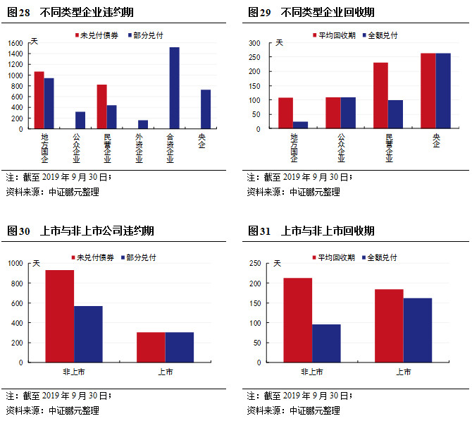 回收期方面,央企和民營企業的平均回收期相對較長,約為7-9個月;全部兌付的債券中,地方國企的平均回收期較短,在1個月之內。非上市公司平均回收期為7個月,高于上市公司的半年回收期;在全額兌付的債券中,上市公司的平均回收期反而要高于非上市公司。