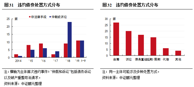 2018年之后,違約事件進入常態化,以法律手段“逃債”成為主要處置手段。2018年-2019年9月,有處置信息的54家違約主體,34家采取仲裁或訴訟手段,其中采用了債務訴訟16家、破產重整的18家。僅采用非法律手段的20家,主要采用手段以延期或展期(7家)、債務重組(7家)、資產處置(6家)等自主協商的方式進行。此外,奧馬電器還利用了紓困基金對其違約債券進行了兌付。