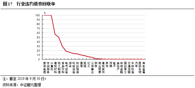 從行業來看,由于家用電器、休閑服務、計算機行業的違約債券較少,均已經全額兌付。其他違約債券較多行業中,輕工制造的回收率較高,在50%以上;食品飲料、綜合、機械設備、紡織服裝、公用事業、采掘的回收率一般,在8%~30%之間;化工、商業貿易、建筑裝飾的回收率較低,在1%~6%之間;房地產、交通運輸行業目前沒有回收的情況。