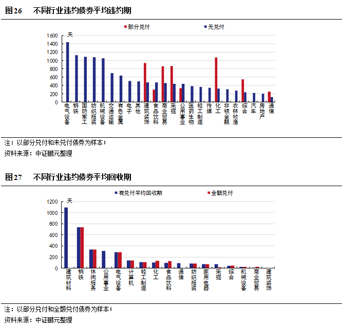 從部分兌付和未兌付違約債券的違約期看,部分兌付的債券中,化工行業的平均違約期最長,約2.94年,公用事業、食品飲料、通信時間較短,均在1年之內;無兌付的債券中,電氣設備、鋼鐵、國防軍工行業的平均違約期均在3年以上,通信行業平均違約期最短,在半年以內。