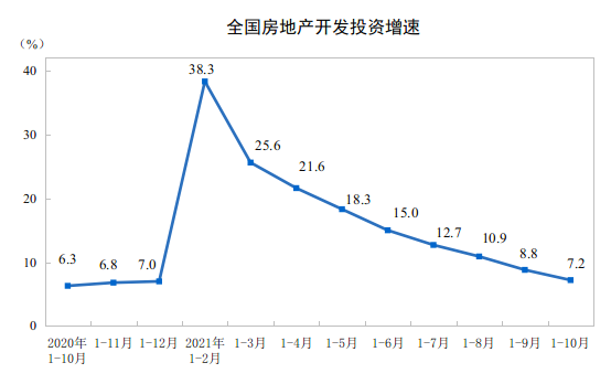 其中,10月房地產(chǎn)開發(fā)投資同比下降5.4%,新開工面積同比下降33%。全國房地產(chǎn)開發(fā)投資增速從1-2月的38.3%,一路下滑至1-10月的7.2%,增速持續(xù)收窄。