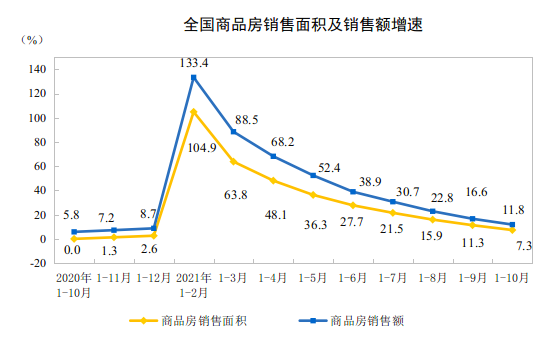 國家統(tǒng)計局?jǐn)?shù)據(jù)顯示,今年前10個月商品房銷售面積14.3億㎡,銷售總額14.7萬億,同比分別增長7.3%和11.8%。