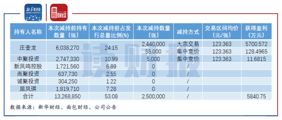 12月23日,公司再次發布可轉債減持公告,實控人莊奎龍和中聚投資在2021年12月13日至12月23日期間通過集中競價、大宗交易方式合計減持鳳21轉債250萬張。根據期間鳳21轉債交易均價123.363元/張計算,控股股東及其一致行動人此次合計套現3.08億元,合計獲得盈利近5841萬元。