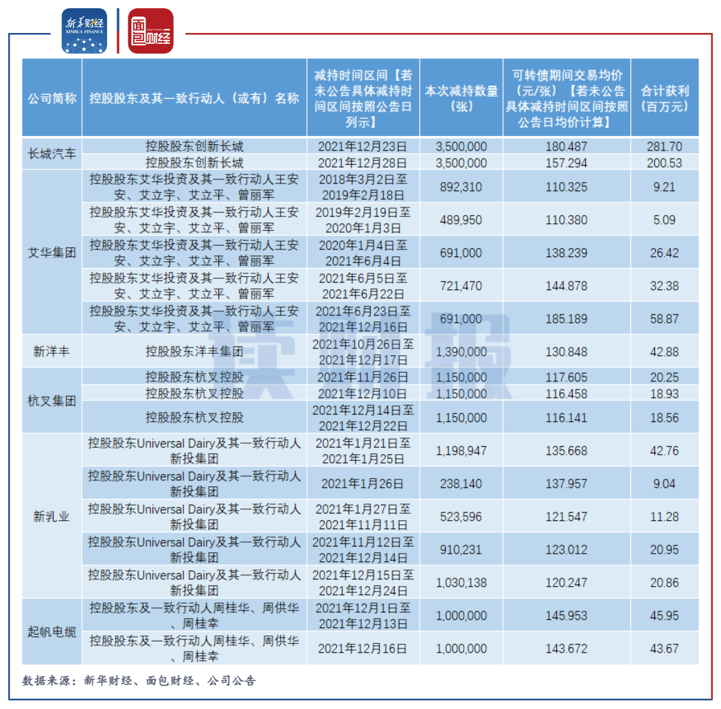 據不完全統計,僅2021年12月至今,就有包括長城汽車、艾華集團、新洋豐在內的逾8家上市公司發布了控股股東減持可轉債的公告。
