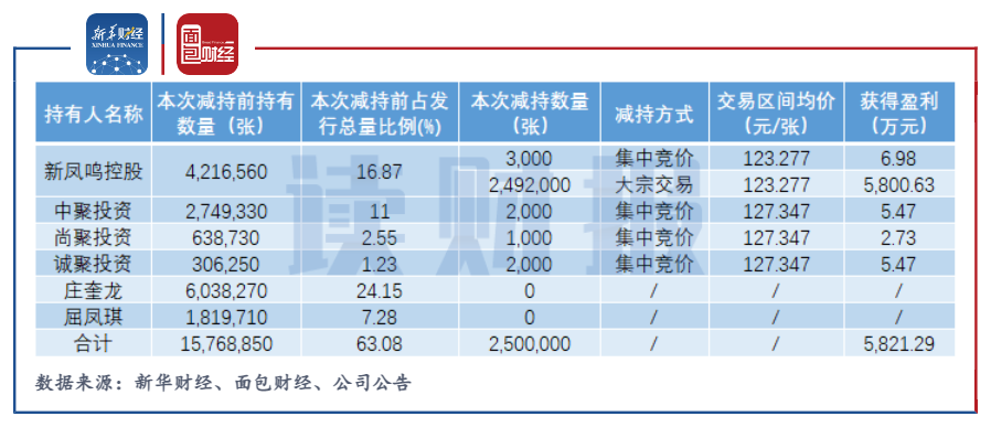 12月7日,公司發布可轉債減持公告,在2021年10月21日至12月6日期間,控股股東新鳳鳴控股及其一致行動人通過集中競價、大宗交易方式合計減持鳳21轉債250萬張。根據相應期間鳳21轉債交易均價計算,控股股東及其一致行動人此次通過減持可轉債合計套現3.08億元,合計獲得盈利近5821萬元。
