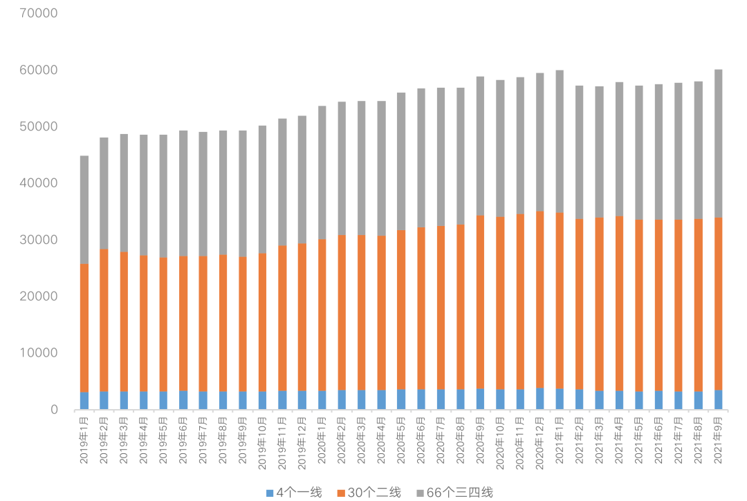 從二手住宅存量市場來看,2021年三季度60城二手住宅庫存迅速積壓。