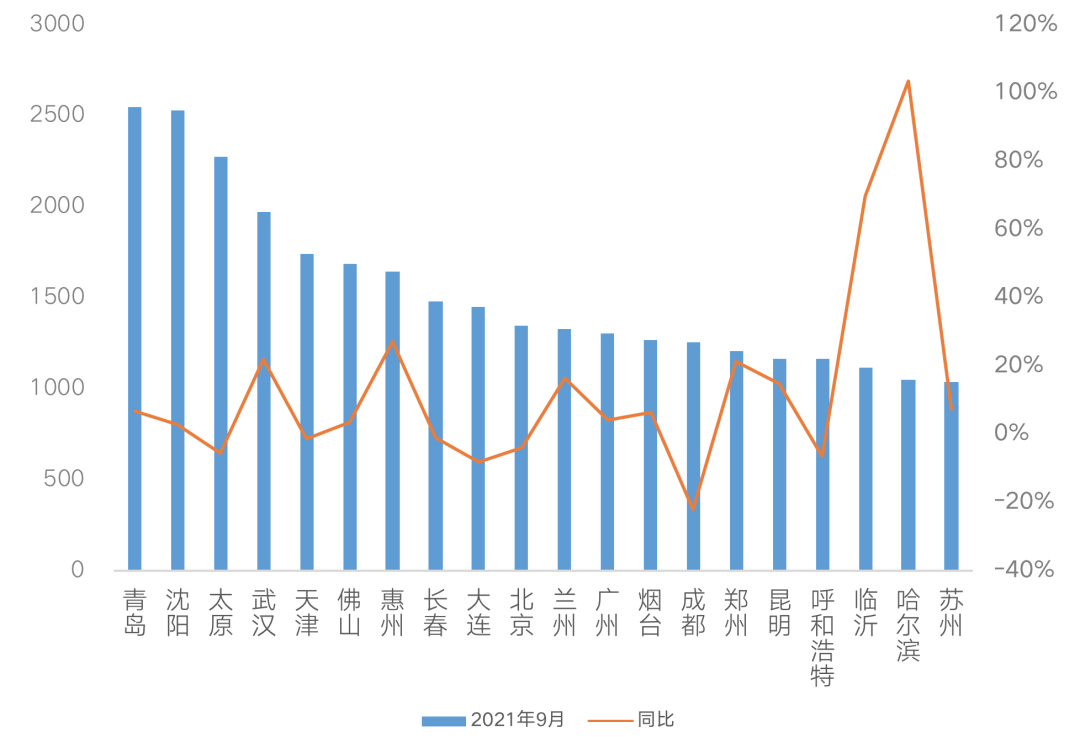 二線城市中,北部內陸城市諸如沈陽、青島、太原9月末狹義庫存量均超2000萬平方米,位列本月末狹義庫存總量TOP3。同比來看,漲跌參半,漲幅超20%的主要是北部和中部等弱二線城市,鄭州、武漢、銀川、哈爾濱、南昌等,庫存積壓情況顯著。