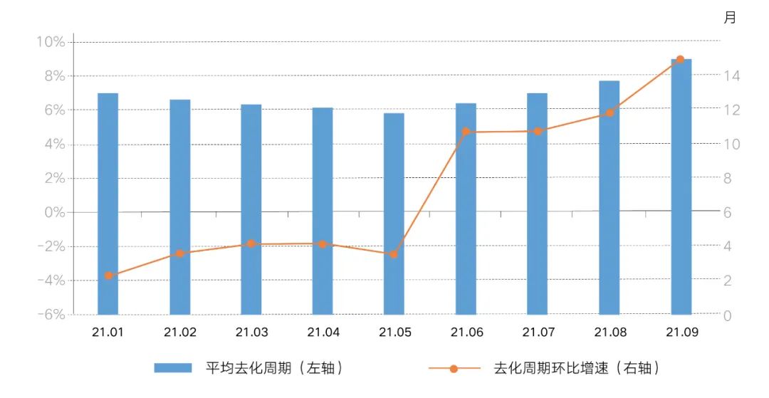 市場下行壓力加劇,成交持續遇冷,加之9月末狹義庫存穩步上揚,導致去化周期加速上行,較8月末的13.04個月上漲至14.92個月。