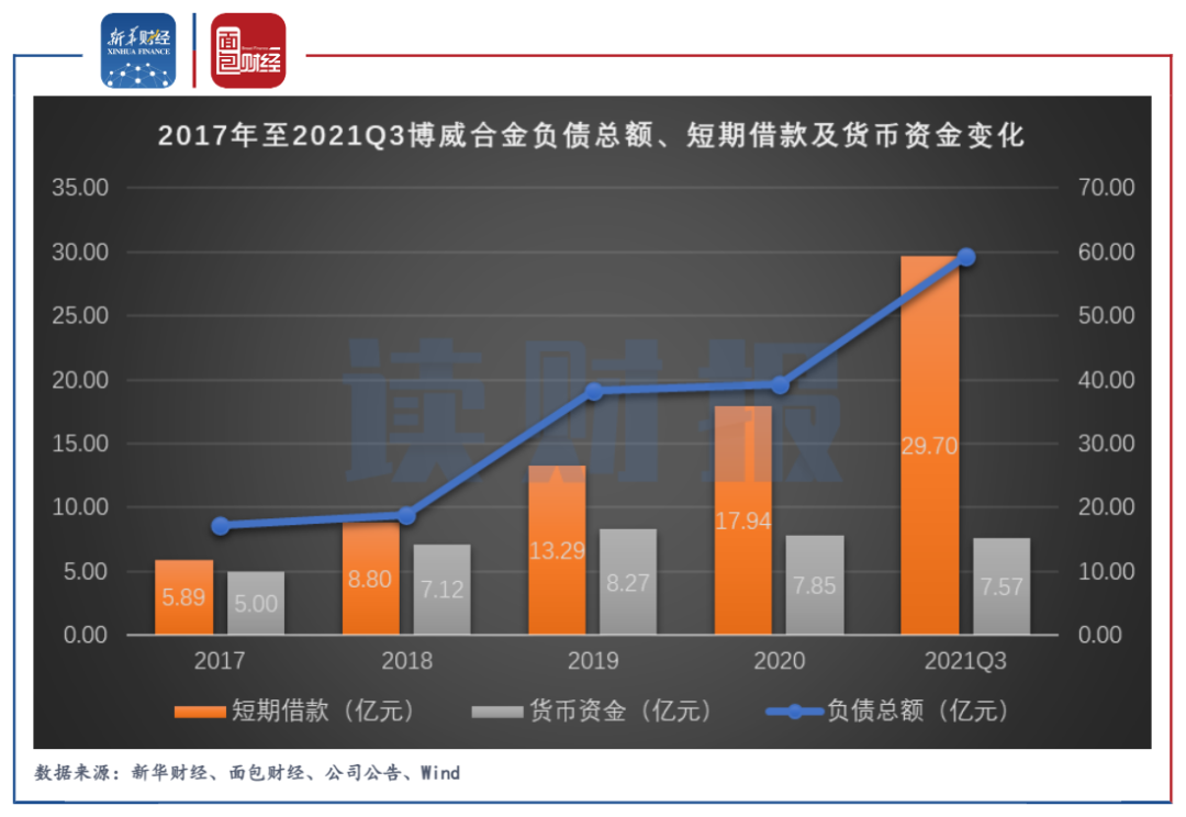 2021年前三季度,博威合金負債劇增。截至三季度末,公司負債總額為59.31億元,同比增加93.89%,較2020年末增加逾50%。其中短期借款為29.7億元,同比增加逾100%;長期借款為6.29億元,同比增加近4倍。