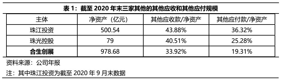 朱氏集團旗下產(chǎn)業(yè)主體囊括合生創(chuàng)展、珠江投資、珠光集團以及新南方集團,業(yè)務多涉及房地產(chǎn)板塊,主體之間的資金往來密切。從其他應收和其他應付款規(guī)模上看,合生創(chuàng)展、珠江投資、珠光集團三家主體均有一定規(guī)模,科目明細中,主體之間也有較多的關聯(lián)。