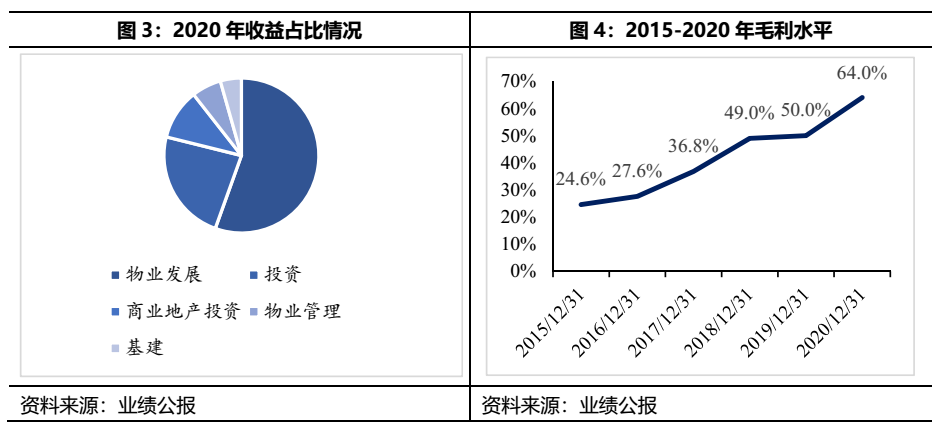 2020年集團業(yè)務主要分為住宅地產(chǎn)、商業(yè)地產(chǎn)、物業(yè)管理、基建和投資五大板塊,各板塊收入占比如下圖所示。2019年合生的業(yè)務版圖新增了基建業(yè)務,2020年繼續(xù)新增投資板塊,公司的業(yè)務版圖不斷拓展,是近幾年的一大轉變。2020年投資業(yè)務財報上的數(shù)據(jù)顯示不論是在營收規(guī)模上還是盈利情況上表現(xiàn)均較為優(yōu)異,貢獻了23%的收入還拉高了整體的毛利。2020年,公司的毛利高達64%,遠遠超過地產(chǎn)公司的平均水平(25%),公司對于高毛利的解釋是由于新增投資業(yè)務表現(xiàn)突出所致。
