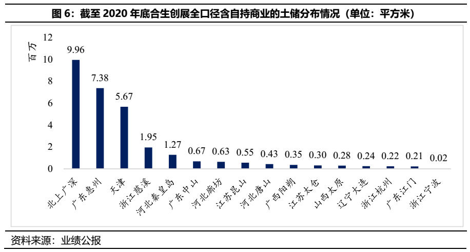 公司項目集中在環(huán)渤海、珠三角和長三角地區(qū),主要分布于北上廣等一線城市。截至2020年底,合生創(chuàng)展位于以上四個城市的總土儲面積達到9.96百萬平方米,占公司總土儲面積的32.72%。由此,公司的項目主要分布在一二線城市,整體土儲質量較好。