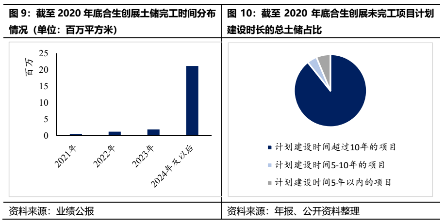 目前,由于歷史囤積的慢去化土儲規(guī)模很大,合生整體的項目周期依然很長。截至2020年底,公司披露的項目總計87個,其中未完工的項目53個,這些項目中未完工面積占比高達90.67%。時間節(jié)點上看,以上絕大多數(shù)的未完工面積都將于2024年及以后完工,項目周期之長顯而易見。而進一步對這些未完工項目進行整理,發(fā)現(xiàn)約89%的項目開發(fā)時間超過10年,部分在廣州、惠州、北京的土儲拿地時間超過了20年,這些土地當年的拿地成本很低,并且區(qū)位均較好,未來隨著這部分土儲逐漸建設銷售,勢必會帶來很高的溢價。