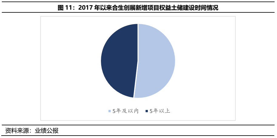 剔除上述的歷史囤地,可以發(fā)現(xiàn)合生創(chuàng)展近年來加快了高周轉項目的布局,2017年后,合生創(chuàng)展新增項目權益土儲建設面積中,52%的建設時間在5年以內(nèi),建設時間5年以上的項目僅兩個,主要是廣州番禺區(qū)南村鎮(zhèn)舊改項目土儲面積較大,放大了這部分的占比。