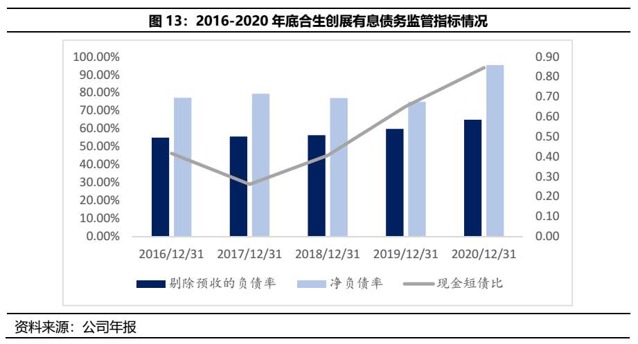 受益于早期囤地的慢周轉模式,合生創(chuàng)展的債務監(jiān)管指標總體尚可,僅現(xiàn)金短債比一直較低,近年來有所改善。截至2020年末,合生創(chuàng)展的剔除預收的負債率、凈負債率、現(xiàn)金短債比分別為64.93%、95.34%、0.84,觸及一條紅線,觸及紅線的現(xiàn)金短債比指標近年來持續(xù)提升。
