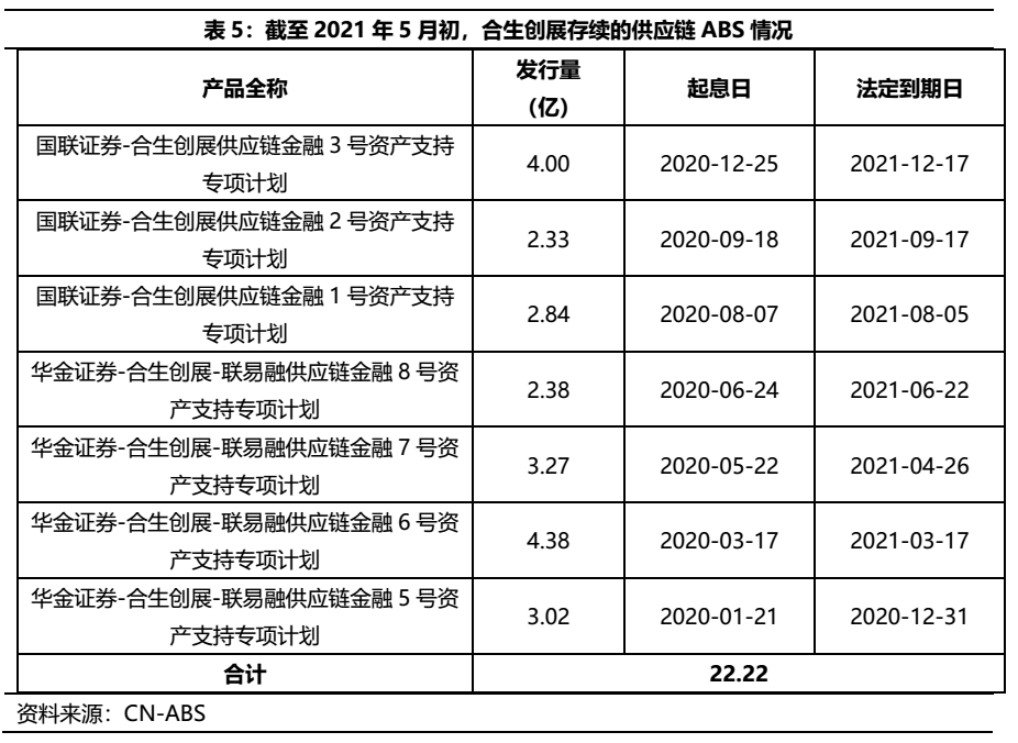 由于一直以來的低成本囤地和低周轉模式,早期舊改和協(xié)議拿地較多,導致合生創(chuàng)展的供應鏈ABS存續(xù)規(guī)模較少,多為近期的項目發(fā)行。截至20年5月初,供應鏈ABS存量僅約22億元。