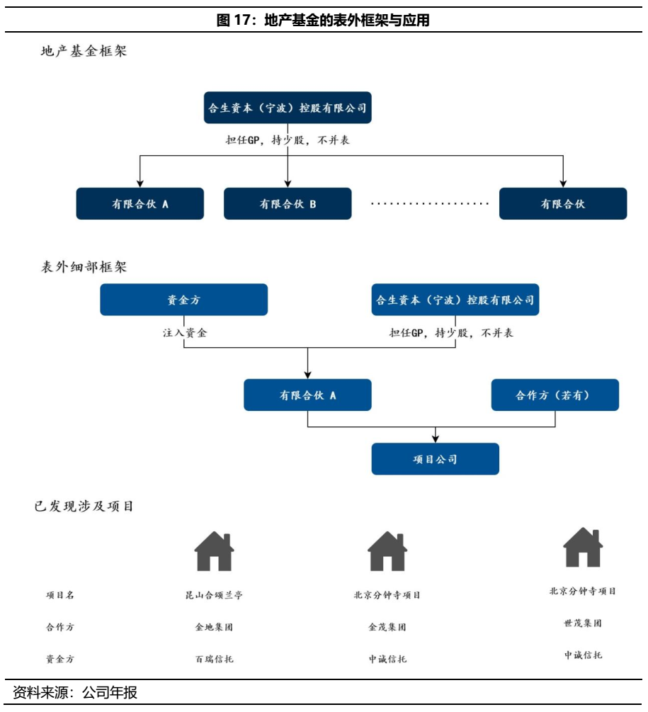 有別于其他地產(chǎn)基金多拓展其他房地產(chǎn)開發(fā)商業(yè)務,合生創(chuàng)展的地產(chǎn)基金“合生資本(寧波)控股有限公司”多聚焦于內(nèi)部項目融資,以多層嵌套方式提供表外資金支持。但由于合生創(chuàng)展擴張期發(fā)展較晚,目前涉及的表外融資項目規(guī)模較小,建議持續(xù)關注其后續(xù)擴張進展。