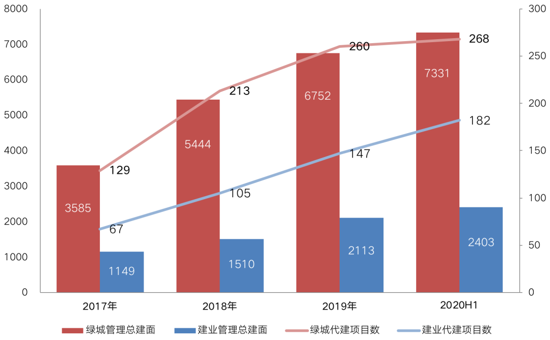 從規(guī)模來看,綠城管理的管理總建筑面積相對較大。2020年上半年,綠城管理的在管建面達到了7331萬平米,代建項目個數(shù)達到了268個,分別比中原建業(yè)高出了205%及47%。