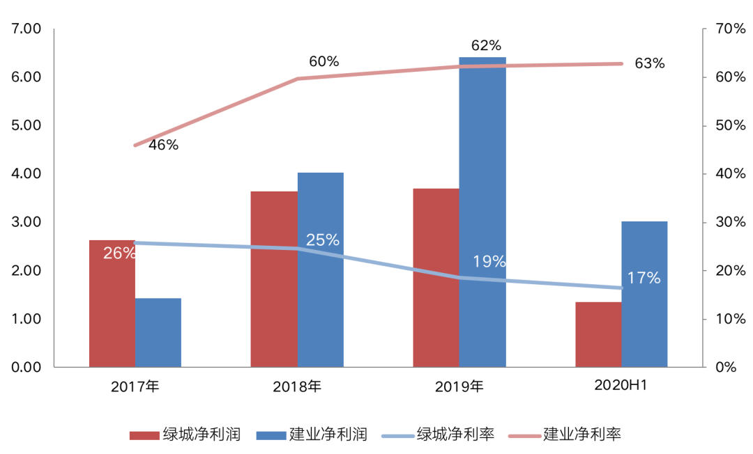 從凈利潤的規(guī)模來看,中原建業(yè)自2018年起實現(xiàn)了反超,2020上半年中原建業(yè)的凈利潤為3.02億元,相比綠城管理高出了125%。從凈利率來看,2018年起中原建業(yè)的凈利率均維持在60%以上,2020年上半年中原建業(yè)的凈利率為63%,相比綠城管理高出了約47個百分點。