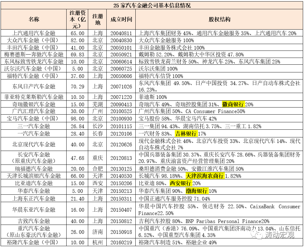 一、25家汽車金融公司基本情況