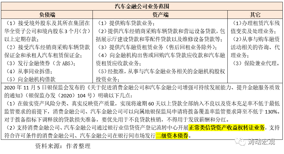 當然,政策層面目前正采取一些舉措改善汽車金融公司的資金來源單一的問題。例如,2020年11月5日銀保監會發布的《關于促進消費金融公司和汽車金融公司增強可持續發展能力、提升金融服務質效的通知》(銀保監辦發(2020)104號)便提出支持消費金融公司、汽車金融公司通過銀行業信貸資產登記流轉中心開展正常類信貸資產收益權轉讓業務,支持符合許可條件的消費金融公司、汽車金融公司在銀行間市場發行二級資本債券。