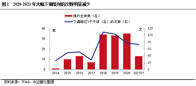 此外,我們觀察到,2018-2020年均有違約當日才進行首次級別下調的情況,造成級別斷崖式下降。其中,2018年有5家,2019年和2020年各1家,在2021年截至目前尚未發生。這也反映出,評級機構也在不斷地調整評級機制,避免這種毫無預警的斷崖式下調。二、預警次數顯著增加,預警時間大幅提前